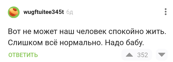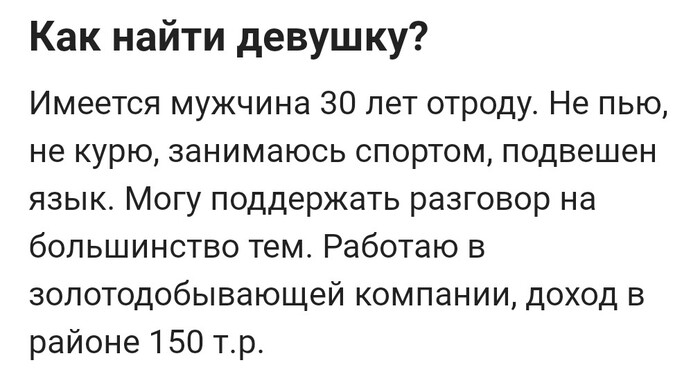 Как попутчик Ржевский до синевы пьян и слегка брит) или до синевы выбрит и слегка пьян. Вот и гадай что им от нас надо. Мы то знаем, хозяйственная, домашняя, понимающая, верная, надёжная. А вот им пойми попробуй) то ли клубнику с огурцами солёными то ли ананас с крыжовником