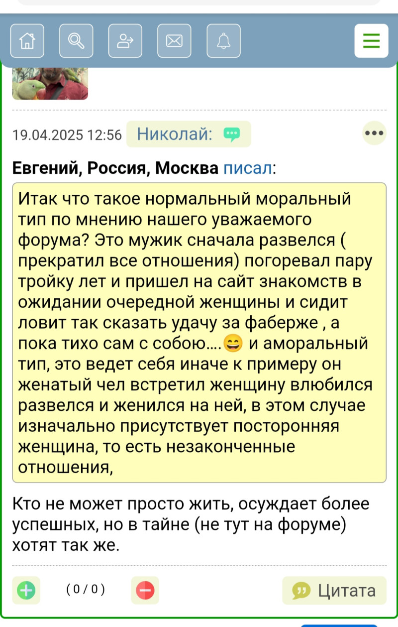 Итак что такое нормальный моральный тип по мнению нашего уважаемого форума? Это мужик сначала развелся ( прекратил все отношения) погоревал пару тройку лет и пришел на сайт знакомств в ожидании очередной женщины и сидит ловит так сказать удачу за фаберже , а пока тихо сам с собою….😄 и аморальный тип, это ведет себя иначе к примеру он женатый чел встретил женщину влюбился развелся и женился на ней, в этом случае изначально присутствует посторонняя женщина, то есть незаконченные отношения,
