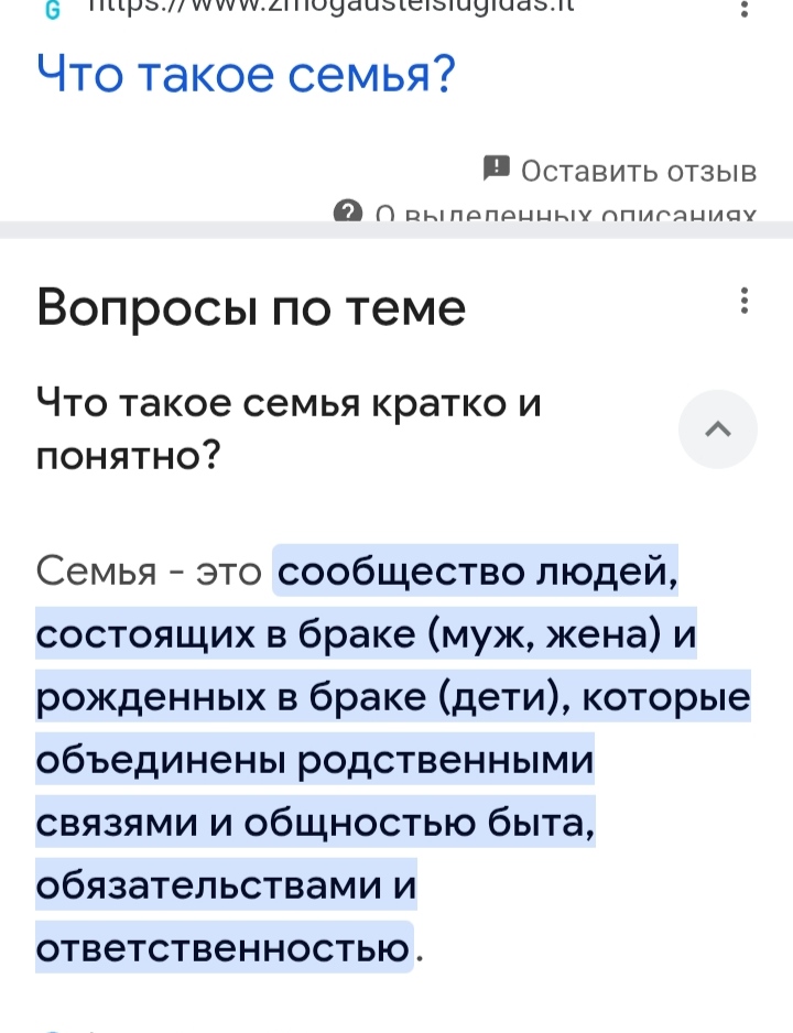Простыми словами что такое семья. Так и гугл говорит и всякая Википедия. И люди также. Семья, это официальный, или гражданский брак двух людей, их детей, также можно и отнести сюда и бабушек с дедушками.