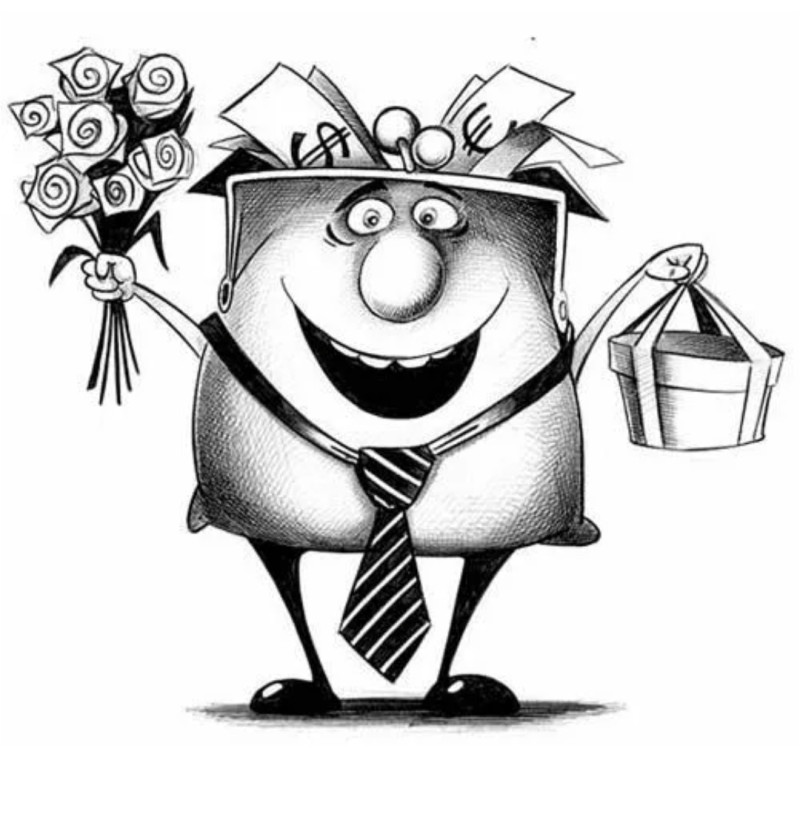 Да что тут гадать. Нужен банкомат ходячий. Терминал банкомата с ножками в тулфлях. Сбоку ручки с портфелем потёртым. Шляпа на банкомате.