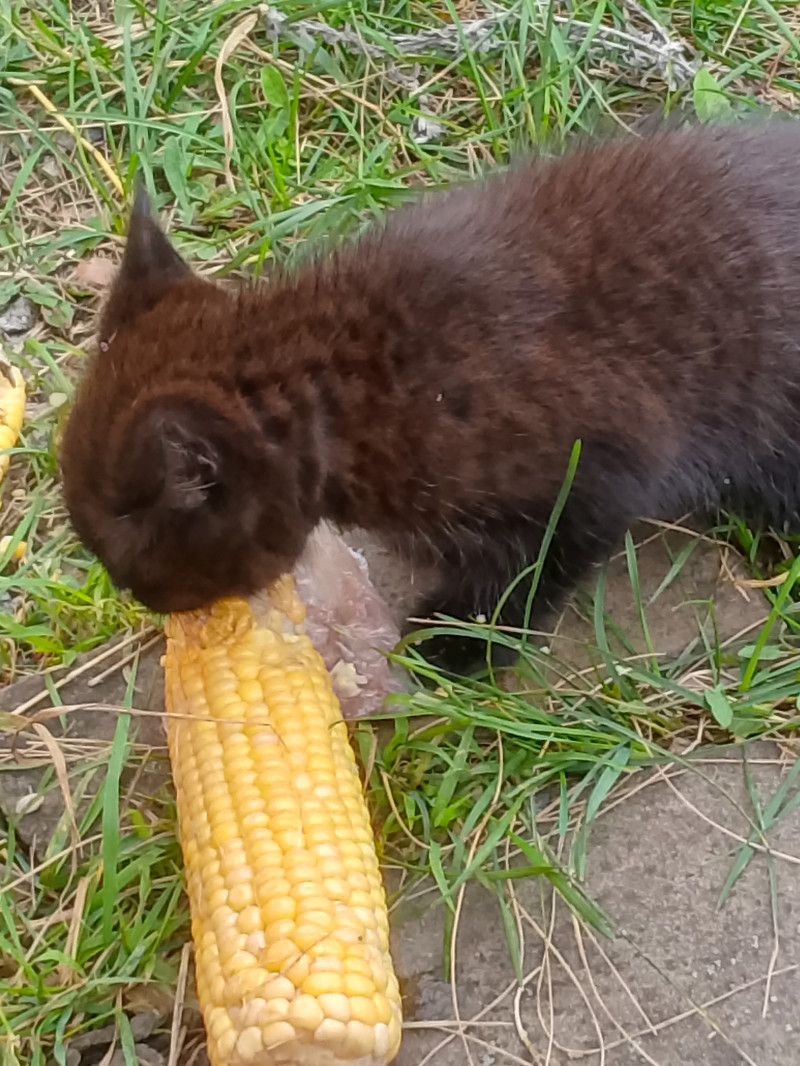 Что мать, что котенок. Сроду не знала, что они едят варёную кукурузу. Четыре початка слопали.