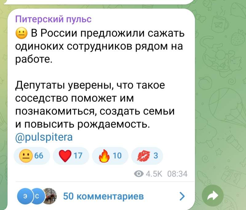 ❗️ В России хотят ввести учет одиноких мужчин. Активисты предлагают фиксировать тех, кто не ходит на свидания, в специальном реестре МВД с последующим призывом в армию. Кроме того, инициаторы считают, что если мужчина не проявляет заинтересованности в отношениях с противоположным полом и не встречается с девушками три месяца подряд, его необходимо направить на обязательные работы.