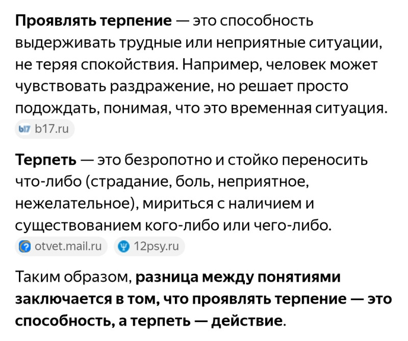 Для общего развития...терпеть и проявлять терпение -разные вещи.
