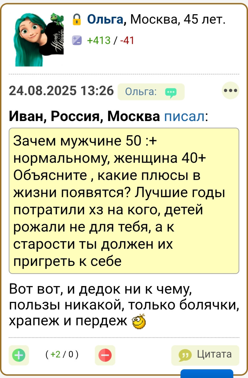 Я старый и опытный. Когда читаю вот такие тексты "Вот вот, и дедок ни к чему, пользы никакой, только болячки, храпеж и пердеж", они меня сильно веселят. Причём мужики не жалуются