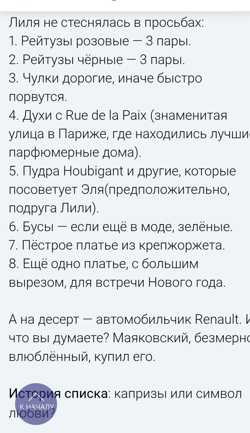 Кстати, вот ее список желаний к Маяковскому, который уехал в Париж. На форуме за это бы сожгли у позорного столба🤣