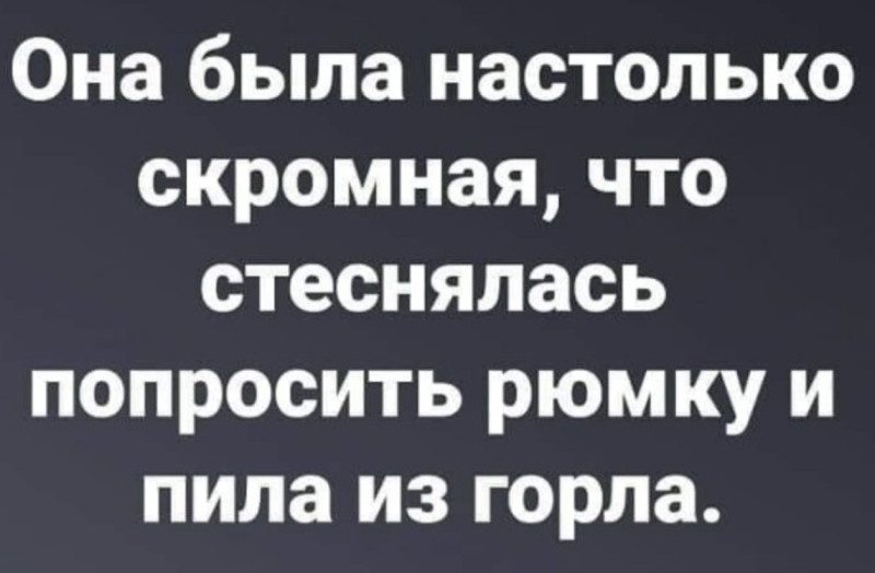Хочешь узнать, что я о тебе думаю? Купи мне литр водки, садись поудобней и слушай... Проводник: - Чай, кофе, водка? Пассажир: - Какой-то странный у вас коктейль... В Чёрном море столкнулись два танкера: с водкой и соком. Пятно "Отвёртки" было ликвидировано быстро и с удовольствием. Но на следующее утро стая небритых дельфинов потребовала танкер холодного кефира
