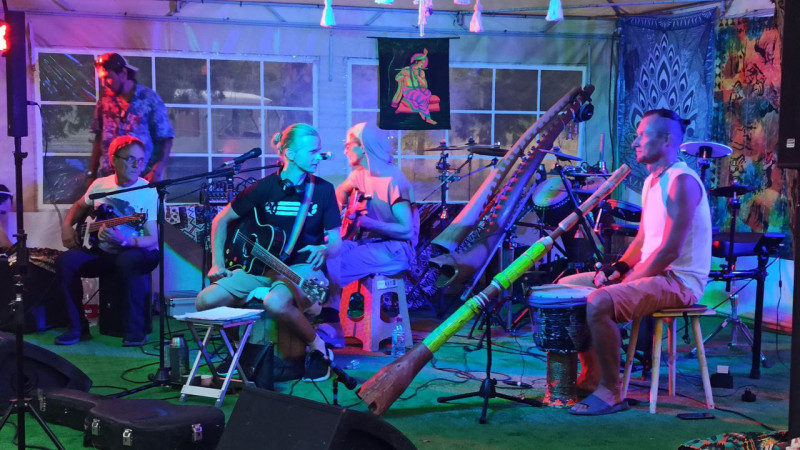 музыканты пиво пьют всё время, кроме деджиридутчика, он берёт что-то покрепче