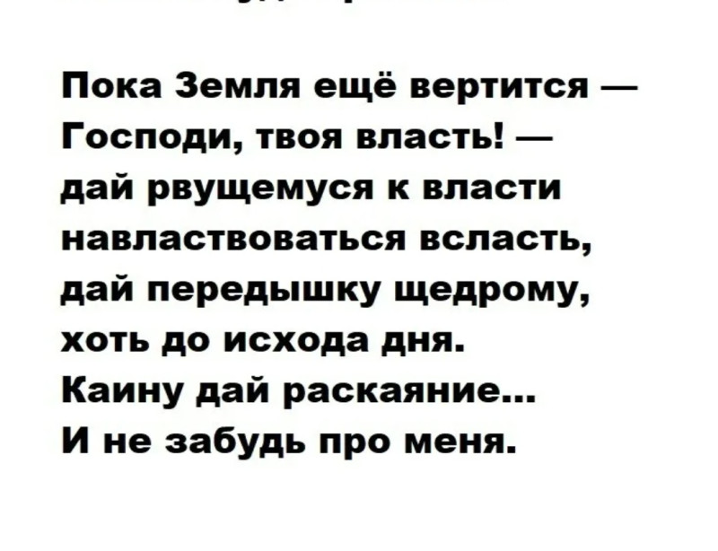 Пока Земля еще вертится, пока еще ярок свет, Господи, дай же ты каждому, чего у него нет: мудрому дай голову, трусливому дай коня, дай счастливому денег... И не забудь про меня.
