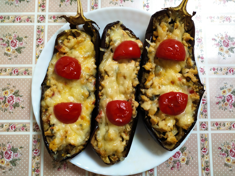 Очень вкусный и простой рецепт запечённых баклажанов, правда не очень быстро, но не более часа. Баклажаны разрезаем пополам, хвостики не отрезаем, на каждой половинке делаем насечки ножом, чтобы быстрее пропёкся, я делаю ромбиком по всей поверхности. Посыпаем солью, перцем, сушёным чесноком, травками, сбрызгиваем каждую половинку оливковым маслом и ставим запекаться в духовку. Пока баклажаны запекаются, пассеруем лук на сковороде, затем добавляем туда фарш любой, немного водички, чтобы фарш лучше разошёлся, потом болгарский перец и томаты. Шкурку с томатов можно снять, я не заморачиваюсь и не снимаю. Специи любые по вкусу. Я очень люблю добавлять везде сухой чеснок гранулированный, он придаёт блюдам совершенно иной вкус, нежели свежий. А иногда добавляю и свежий и гранулированный вместе. Хорошо с этим блюдом сочетается базилик, кинза и другие пряные травы. Фарш с овощами тушим до полной готовности. Когда баклажаны запекутся, разминаем мякоть внутри лодочки, сверху кладем готовый фарш и поливаем соком, который образовался при тушении, сверху посыпаем сыром и для украшения можно положить половинки черри и посыпать травкой. Всё это в духовку, чтобы сыр расплавился и чуть подрумянился. Это оооочень вкусно! Я руку набила и у меня получается готовить быстро. Приятного аппетита!