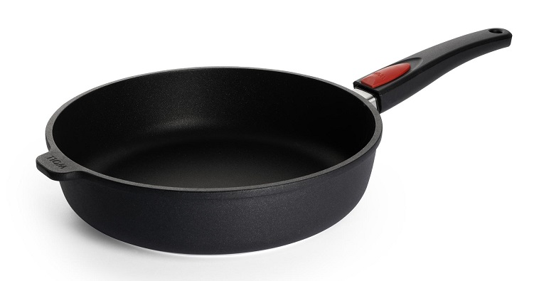 очень тяжелая даже без еды. Ей уже много лет. Пользуюсь аккуратно. Несмотря на то, что можно острыми предметами -всё равно пользуюсь лопаткой деревянной или пластиковой.