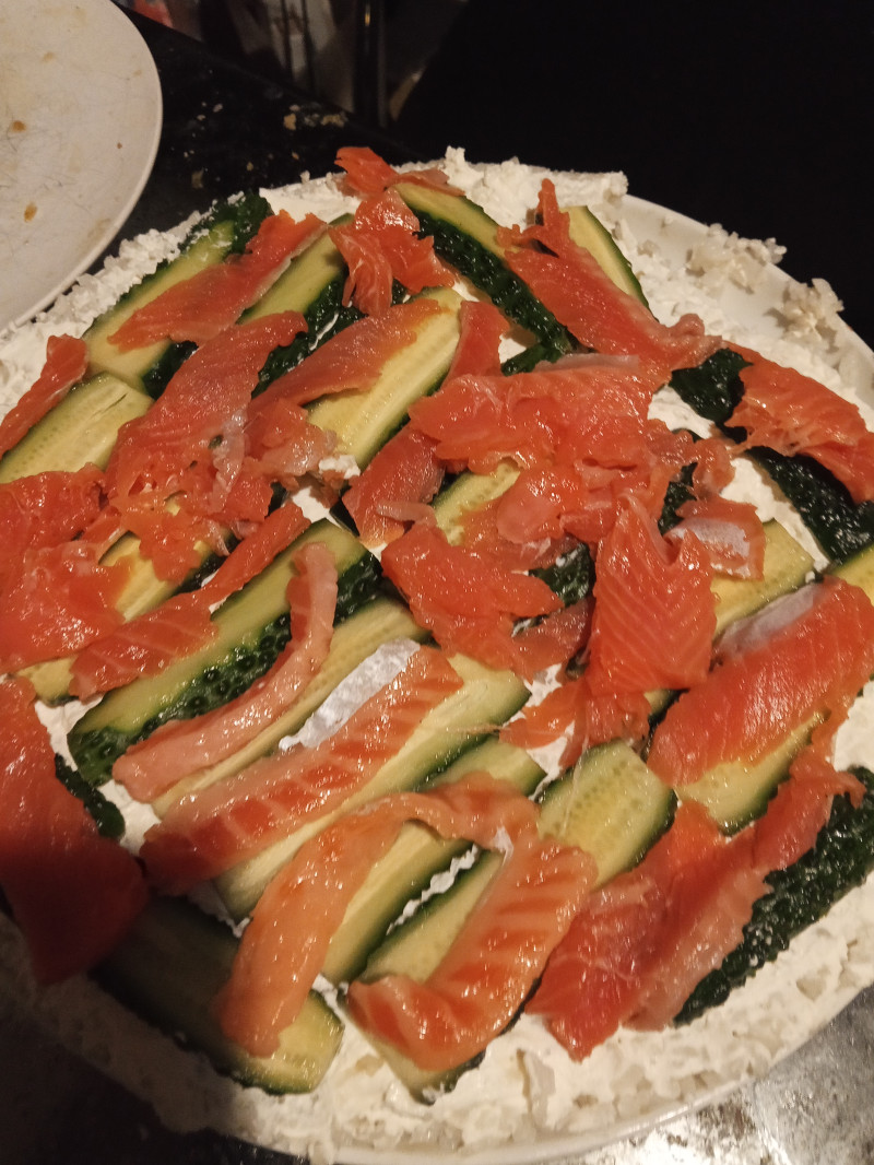 Хотели с сыном суши сделать, но заленились скручивать . Сделали типа суши пирог- рис, творожный сыр, огурцы, форель