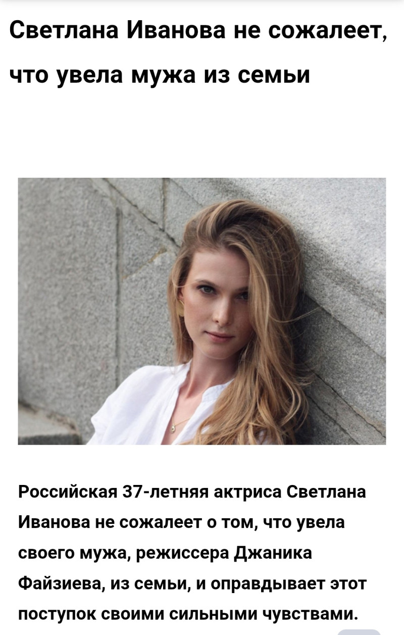 Пресса любит муссировать акценты, которые будоражат воображение читателя... Интервью дала 37летняя Иванова, - значит, старшей общей дочери уже 10, а младшей 4. Странно было бы говорить о сожалении, когда отец твоих детей живёт вместе с тобой в законном браке. Я её не защищаю, вообще к ней ровно. Просто не понимаю, а что от неё хотели услышать в том контексте, который уже много лет как изменился.