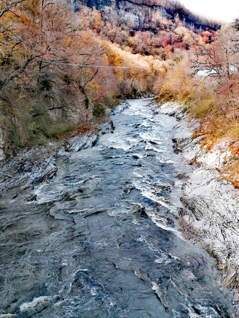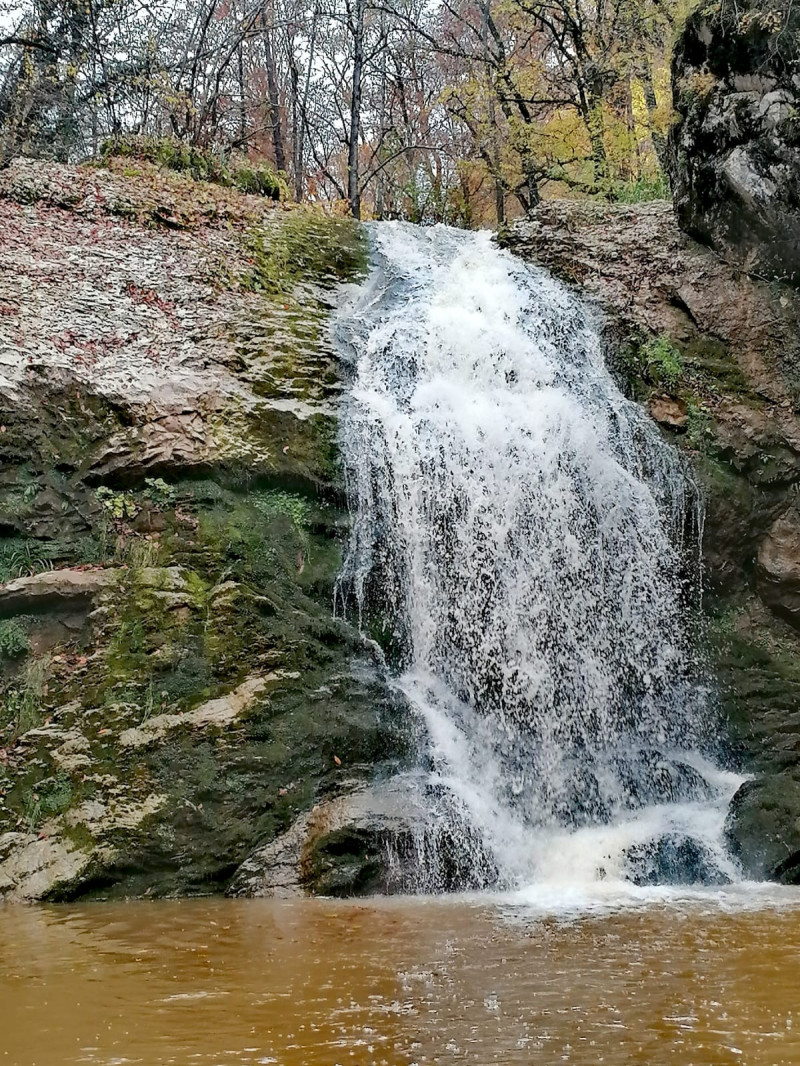 А здесь цвет воды коричневый , из-за суглинистой почвы, а там где цвет воды как купорос, там на камнях водоросли зелёные...