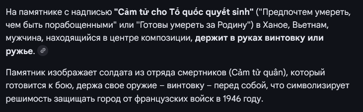 Рассматриваю фотки из Вьетнама и нахожу памятник тётке с мечём, бойцу с автоматом и еще одному мужику с трёхфазной вилкой. Была версия, что мужик держит факел, но в парке был еще один мужик-памятник, который с этой штукой шел в штыковую атаку.
