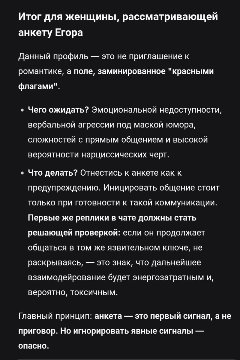 Заключение: Текст производит впечатление не искреннего самовыражения, а тщательно сконструированного образа «идеального партнера», который, однако, построен на психологически нездоровых установках: отрицании негативных эмоций, поиске счастья вовне, размытых личных границах и завышенных ожиданиях от отношений. Вместо готовности к зрелым, партнерским отношениям, здесь прослеживается желание найти «спасательную шлюпку» для решения внутренних экзистенциальных проблем. Можно и так