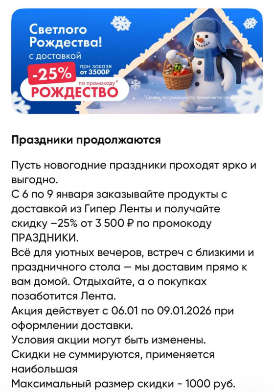 Промокод: РОЖДЕСТВО на доставку из Гипер Ленты. Подробности в приложении магазина.