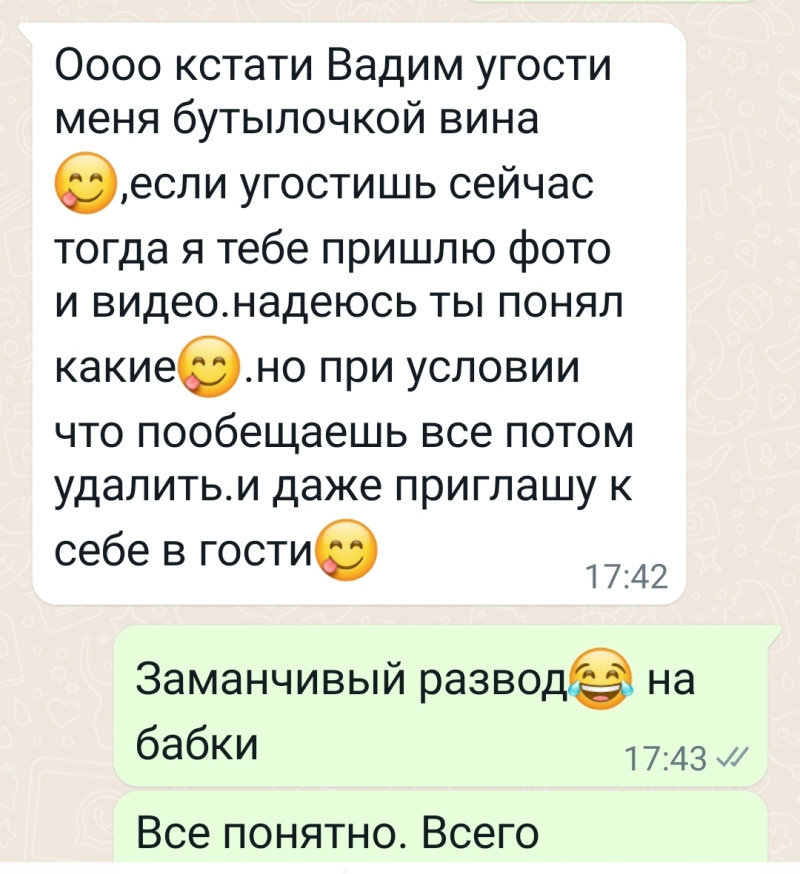 Да была такая хрень пару лет назад. В ТГ. Фотки в купальнике, в раскованных позах, для заманухи, а потом просьба, типа скинь денег, иду мимо КБ ,хочу купить себе винишко на вечер, а потом я тебе скину видео, ну ты понимаешь какое. Ага, щаз, так я и разбежался😂😂