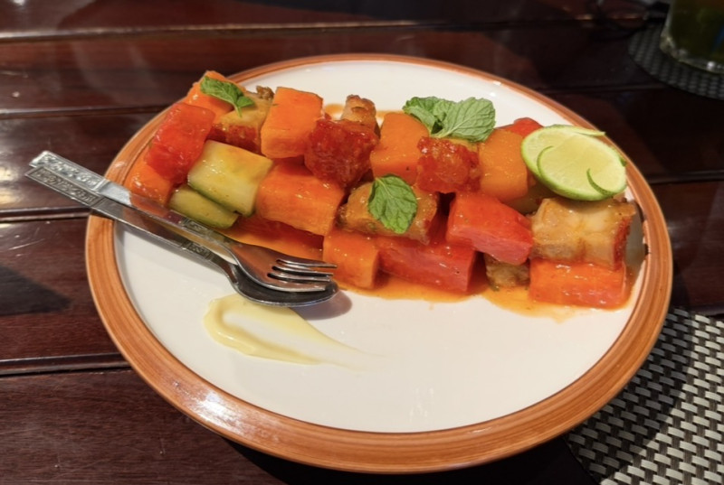 Свинина огурцы папайя и арбуз. Свинина с хрустящей корочкой. Все полито сладко - острым соусом