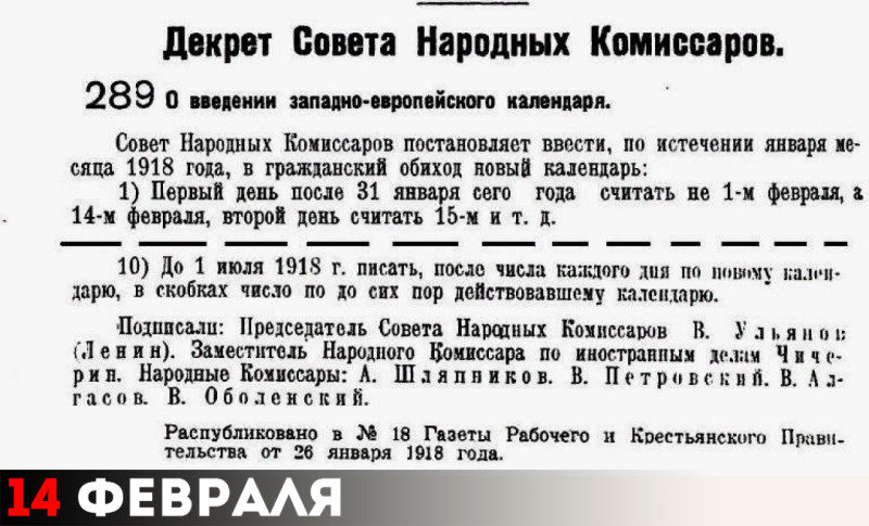 24 января 1918 года Совет Народных Комиссаров издал декрет о том, что после 31 января 1918 года (среда) должно следовать 14 февраля (четверг) — от календаря отпали 13 дней.