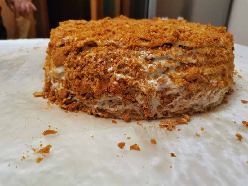 Торт "Медовик" в процессе обсыпки. По праздникам выпекаем. Цвет зависит от мёда. Добавляю гречишный мед.