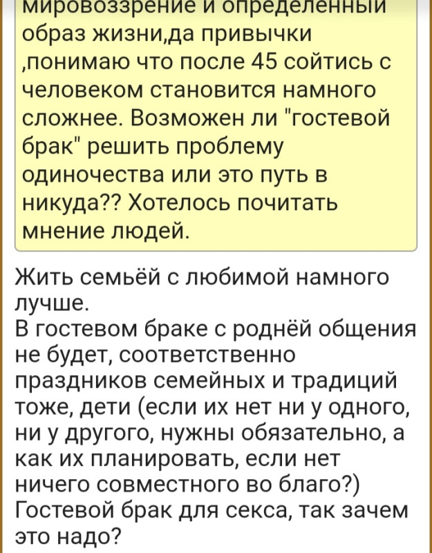 Так это очень важная штука- возраст) В 20 что это за зверь такой- гостевой брак? А в 45, знаете ли, у меня и так родни и обязанностей до фига, чтобы ещё что- то себе добавлять.