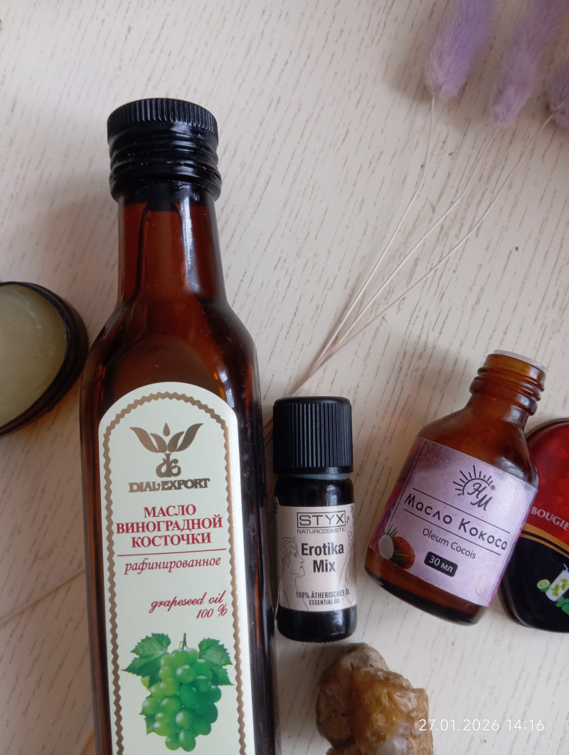 Кокосовое масло 6 частей , воск пчелиный 2 части , масло виноградной косточки 2 части . + 7 капель эфирных масел ( дорогие швейцарские у меня ) . Около 130 мл получилось . На водяной бане .