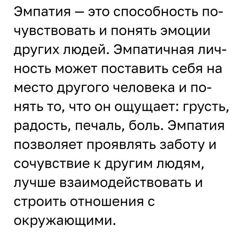 Признаки отсутствия эмпати у человека:1.Осуждение и критика. Эмпатия предполагает понимание того, что люди поступают по разным причинам, но неэмпатичный человек не может поверить в то, что другой человек невиновен, он считает, что действия направлены на то, чтобы делать больно другим. Например, человек подрезает в пробке, потому что ненавидит, или человек глуп, потому что неправильно заполнил форму. 2.Неадекватная реакция: невозможность интерпретации жестов, мимики, эмоций, стоящих за словами, п