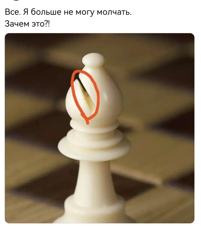 Это шахматный слон (офицер). Щель на его «голове» — это не случайность. Есть две основные причины: 1️⃣ Историческая Фигура произошла от индийского «слона». В Европе её стали ассоциировать с епископом (bishop), а разрез стал напоминать разрез на митре (головном уборе епископа). 2️⃣ Практическая Это простой визуальный признак, чтобы отличать слона от пешки или других фигур — особенно в старых наборах, где формы были похожи. То есть это просто традиционный