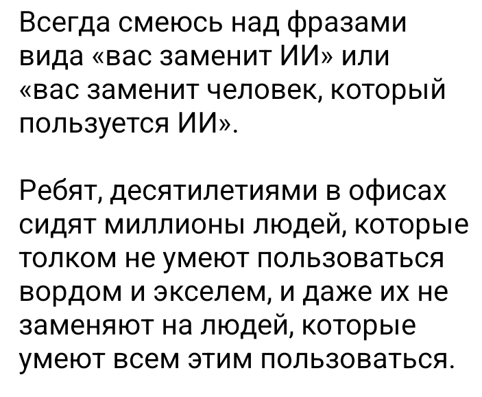 Да Юль, всегда есть факторы, которые делают бессмысленными некоторые профессии и дает возможность развиваться новым! Поверь мне, ИИ дает нечеловеческие возможности человечеству и сейчас это голубой океан, который будут структурировать. Новые профессии уже есть, причём высокооплачиваемые.