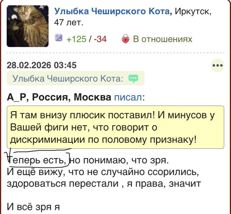 Людям отвечаю всегда взамностью. На добро благодарностью. На злобные нападки своими гневными ответами. А на минусы ставлю такие же знаки внимания. Ревность приписали мужчине который видит и общается как с интересным человеком со мной а не как с женщиной. Даже не льстят такие выводы. И ничего не делаю зря как о себе написали сами в коменте про меня.