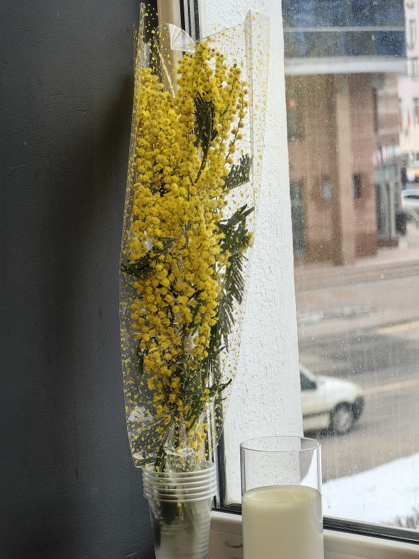 А я шла на работу и увидела около метро машину с цветами, веточка мимозы всего 200 руб. С детства уже мимозы в подарок не получала, купила, мне нравится ее запах.