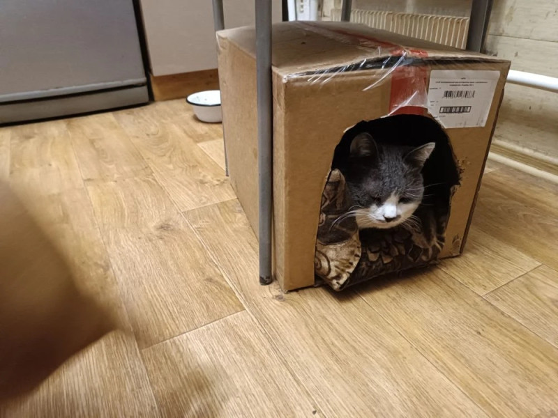 Выбрал место для обитания в коробке. Соревнуется с цвергпинчером, кто первый займёт место))) Цивилизованные лежанки оба игнорируют.