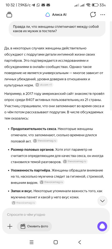 Кстати, она ж тоже вроде женщина? Да? как там насчет неё информация? Ты спроси - кто она? и с кем она делится своими постельными сценами...