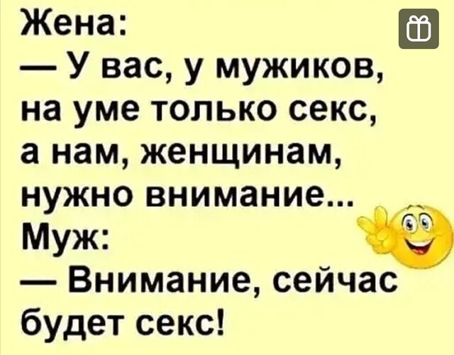Жена упрекает мужа: «Вот ты приходишь вечером с работы и сразу же командуешь: „В постель!“ Нет, чтобы поговорить со мной об искусстве, о литературе…».