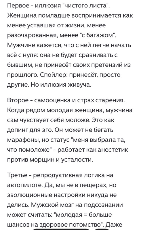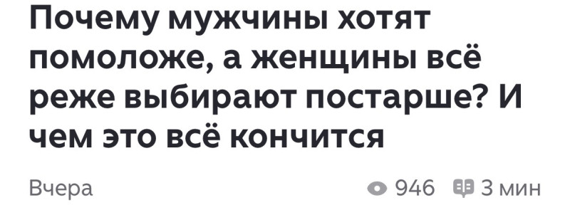 все таки надо по другому вопрос задавать - почему 30-летняя ушла к 50- летнему понятно Вопрос - хоть один 50-летний вахтовик/охранник/рабочий женился на 30-летней? вот чтобы зп - 40 тыщ, и спит в машине. Хоть один?