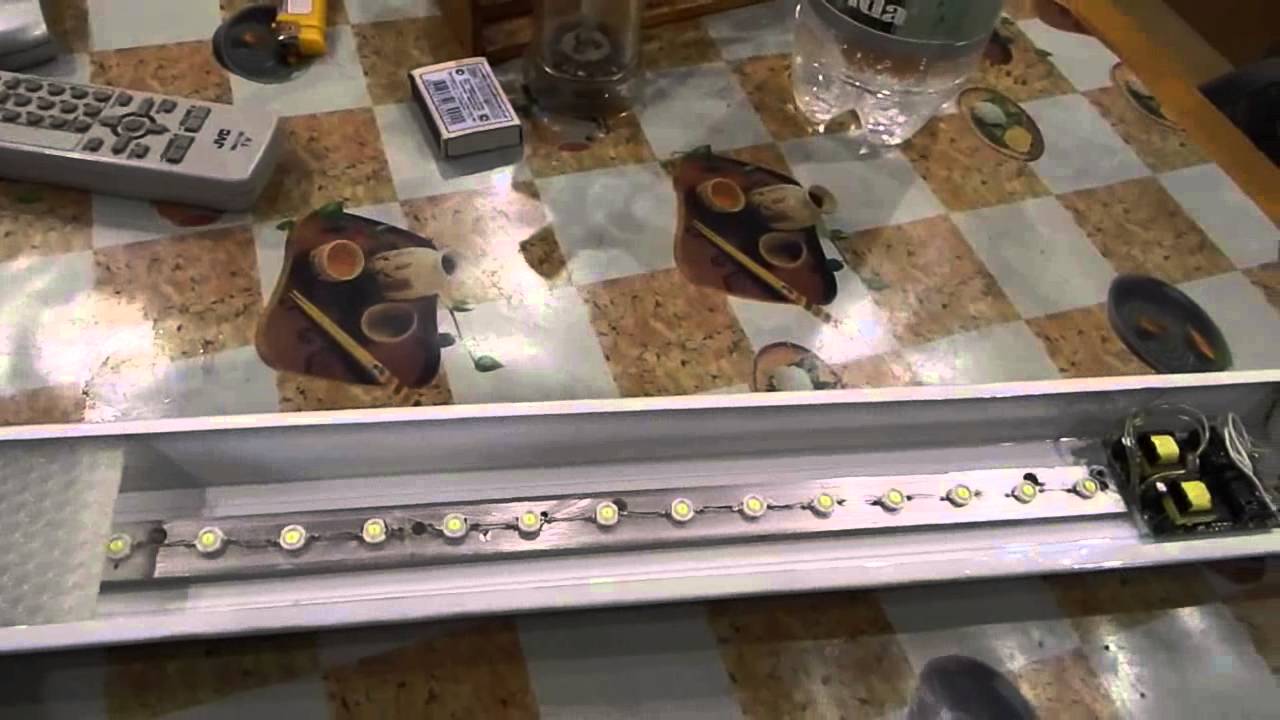 Монтаж светодиодов на радиаторы. Светодиоды 3,5 мм (нельзя их перегреть свыше 215 градусов). Радиатор - алюминиевая профильная труба. Нужно приклеить и спаять по схеме (+ резисторы).
