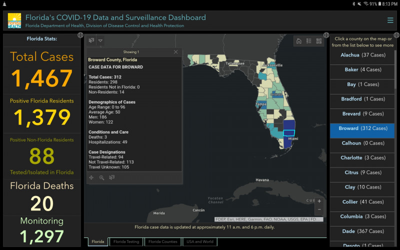Вы как дети, честное слово. Я во Флориде, в районе, где я живу и работаю 312 заболевших (население 1,9 млн чел.)- в том квадратике. Официально. Сколько на самом деле, кто знает. Мы и Майами - рекордсмены. Наконец-то всех прилетающих начали садить на обязательный карантин за их собственный счет, а то ведь число заболевших удвоилось за 2 дня.
