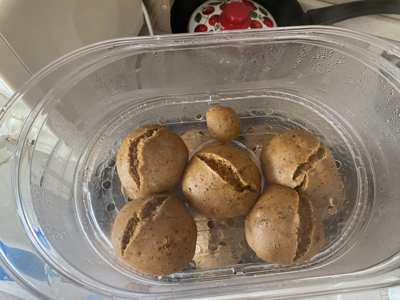 Сформировать мокрыми руками шарики и положить на расстоянии в пароварку. Увеличиваются в размерах сильно.