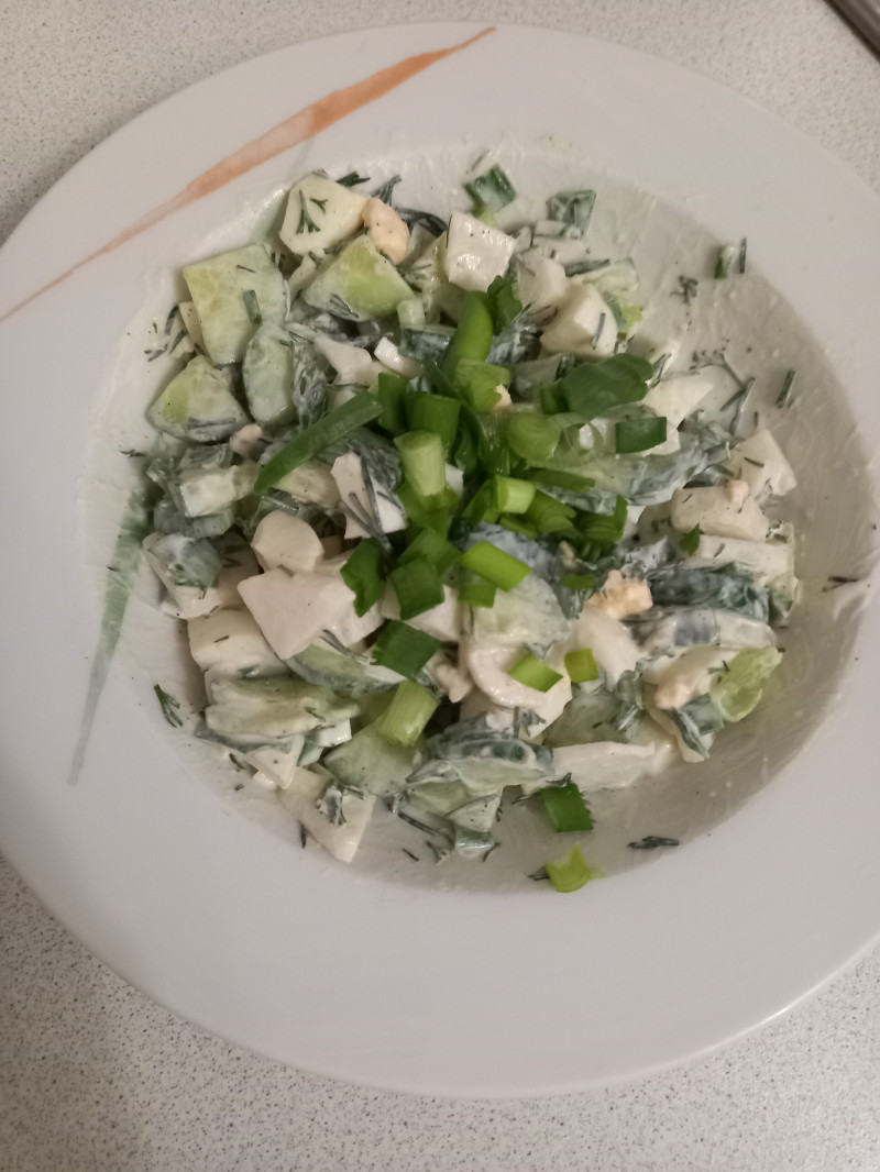 На ужин сегодня салат из огурцов, редиса, яйца, зелёного лука и укропа со сметаной
