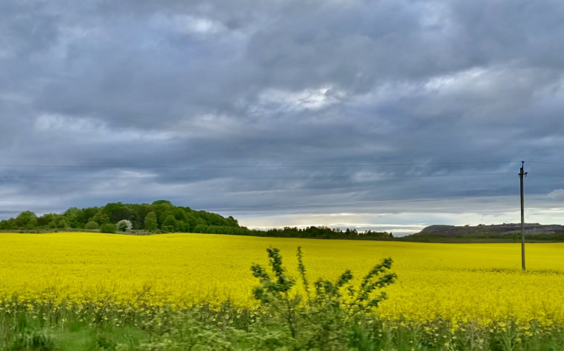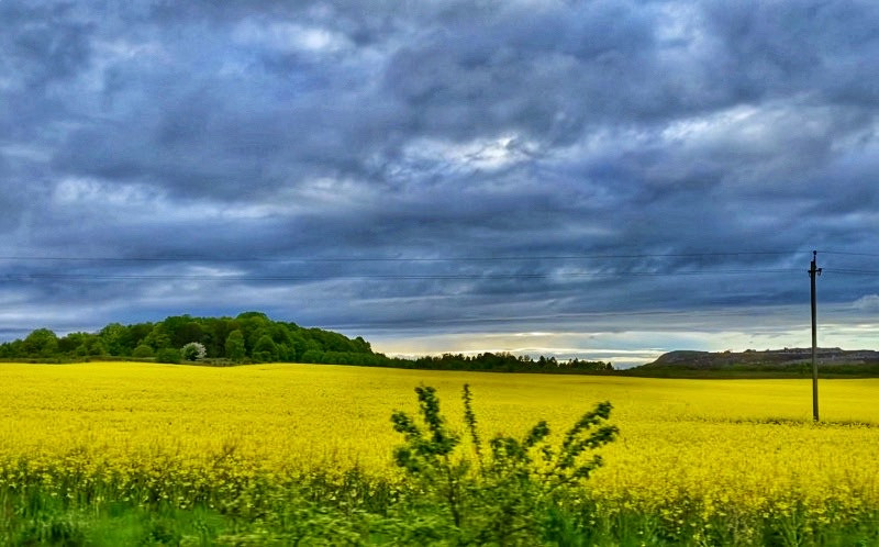 Обожаю желтые рапсовые поля. Он как раз набрал цвет. Едешь и с двухсторон море солнца. Фотки не передают , но очень контрастно против грозовых облаков