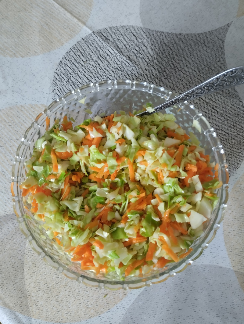 Сегодня мяса не хочется. Сделала салат из молодой капусты и моркови с морской солью, заправленный высокоолеиновым маслом.