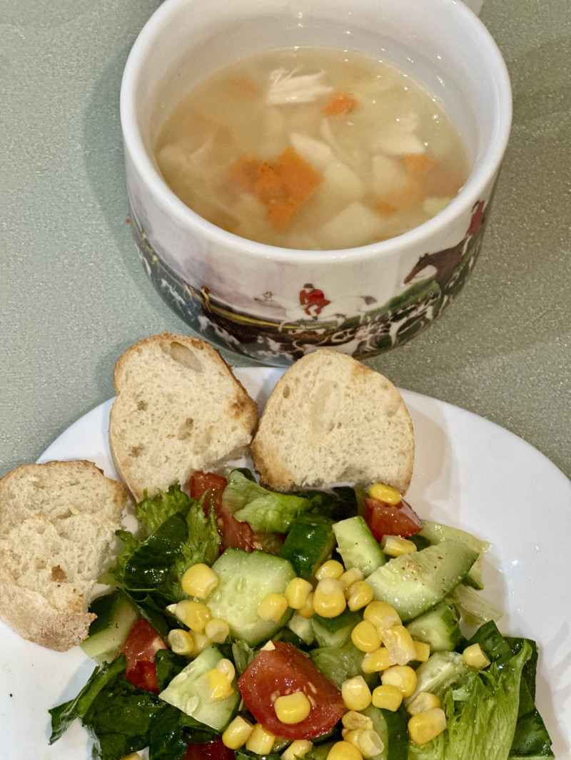 Ужин сегодня легкий) куриный супчик с мелкой лапшой как в детстве , овощной салатик