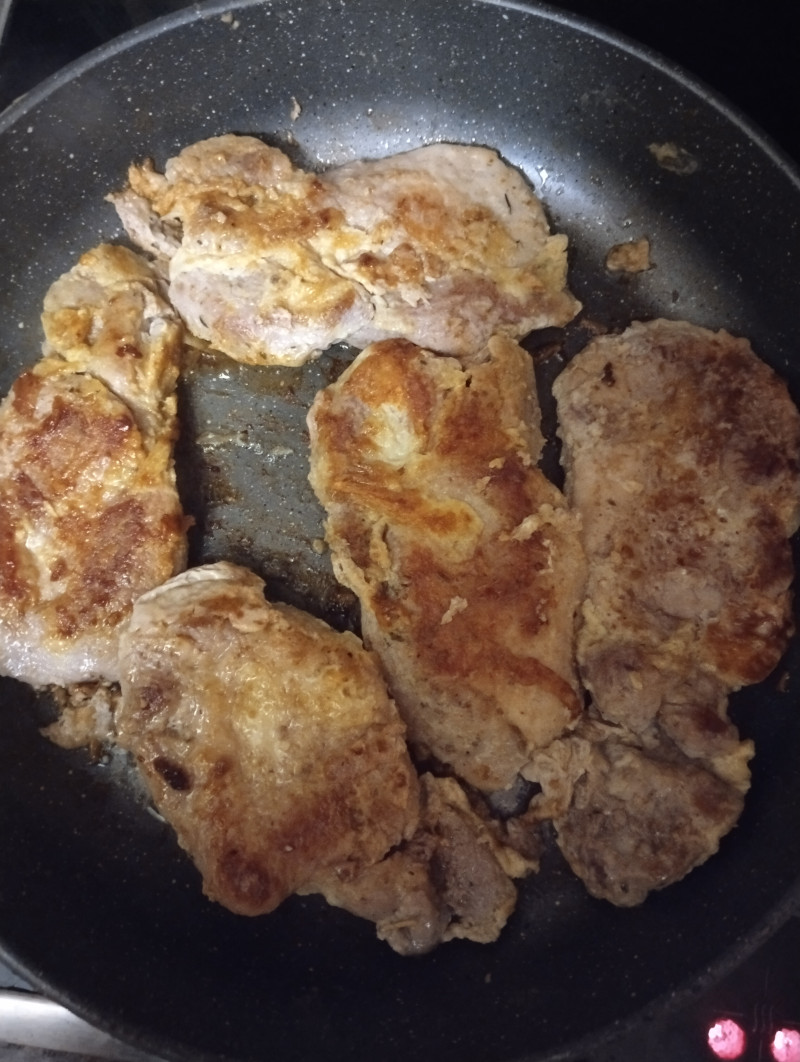 Мясо тоже порезал, отбил(можно не отбивать) в специях и обжарил.