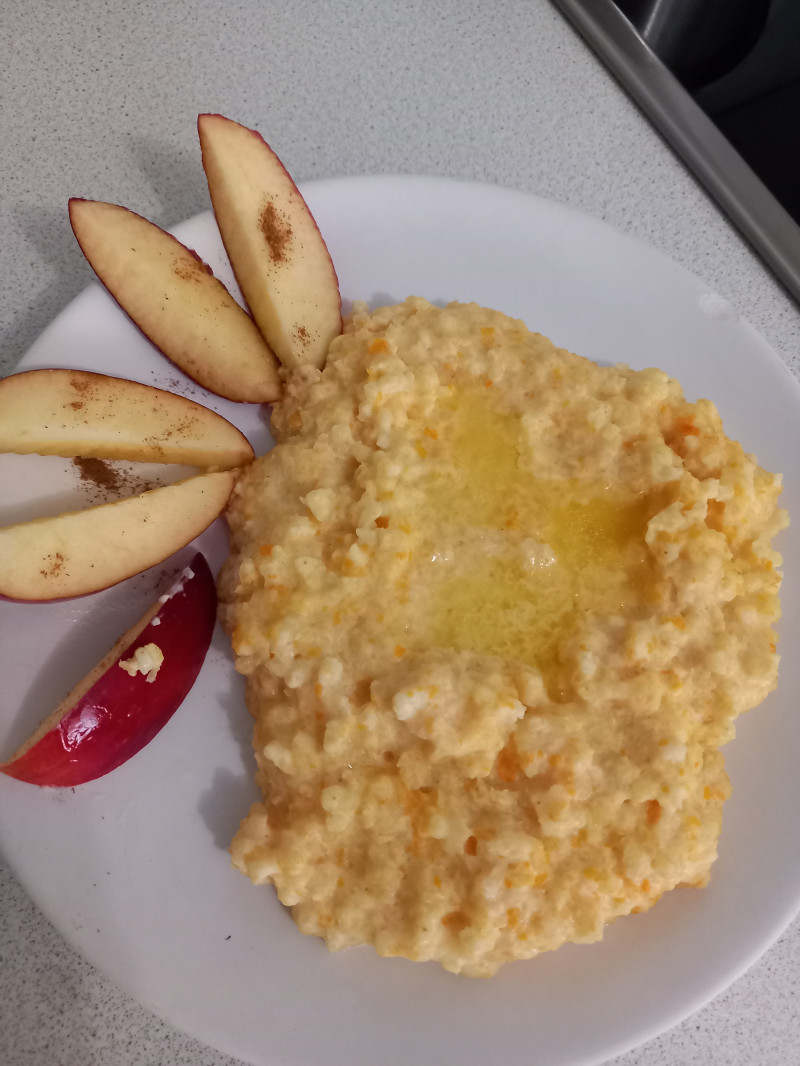 Мой завтрак: каша пшенная на молоке с тыквой, яблоко с корицей, про вторую тарелку все понятно, в кружке чай иван)