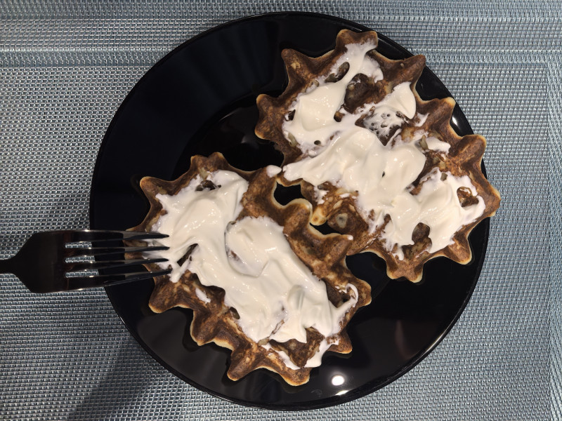 Мой ужин. Кабачковые вафли со сметаной и грибочки запечённые.