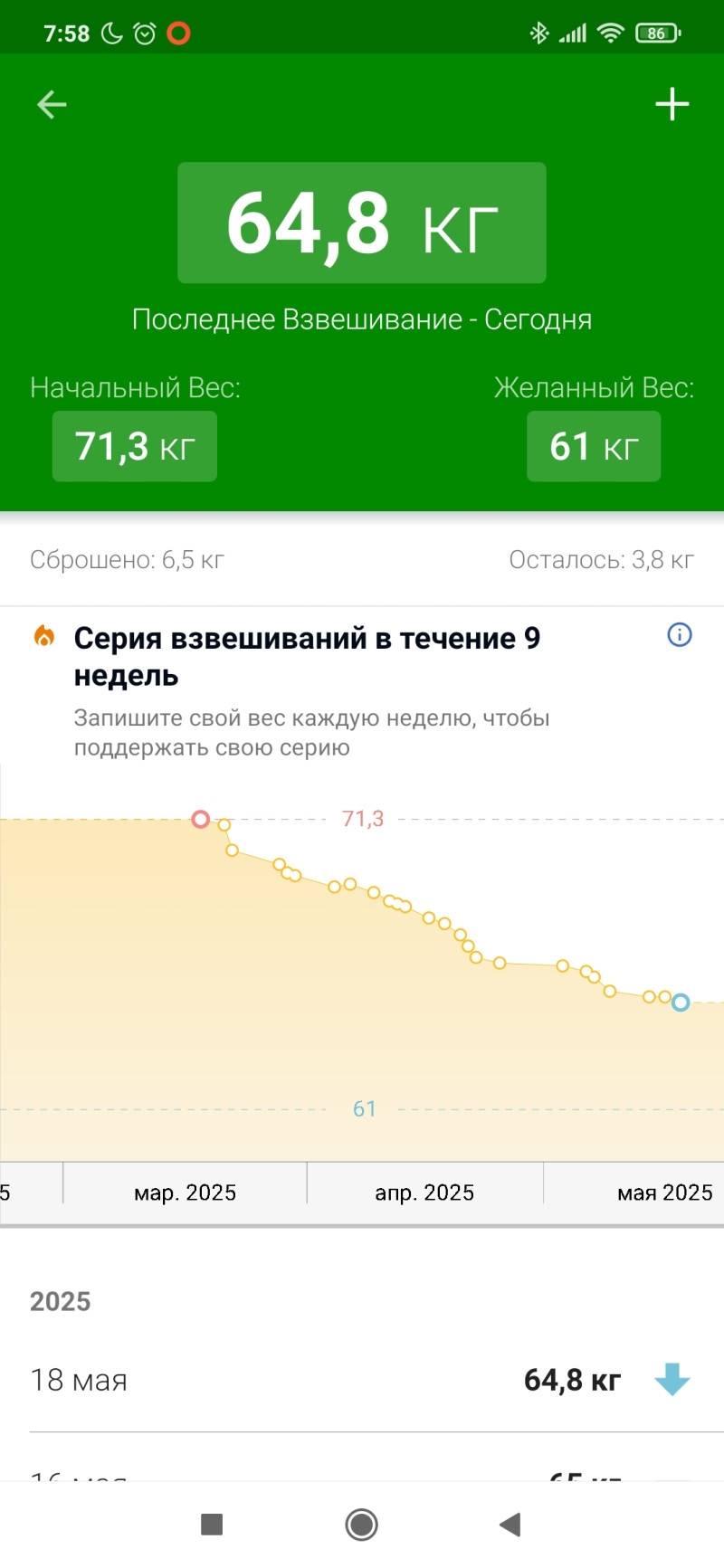 Вот скрин Как считаете, надо дальше продолжать сброс веса, или остановиться и увеличить калории на его поддержание?)