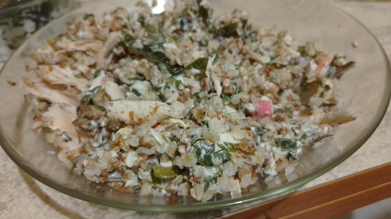 Гречка, немного куриного мяса и морская капуста)