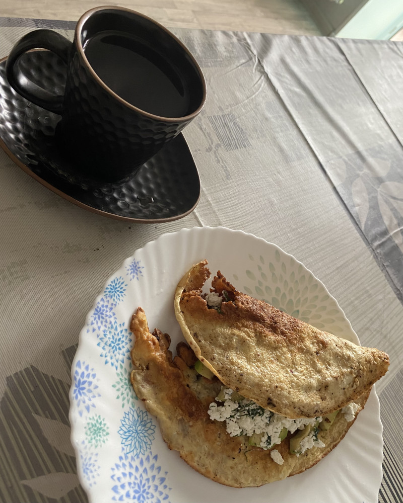 Доброе утро. На завтрак случилась пита. Внутри курица, помидор, салат. Очень сытно и вкусно и быстро. Кидайте рецепты вкусных начиненных пит)