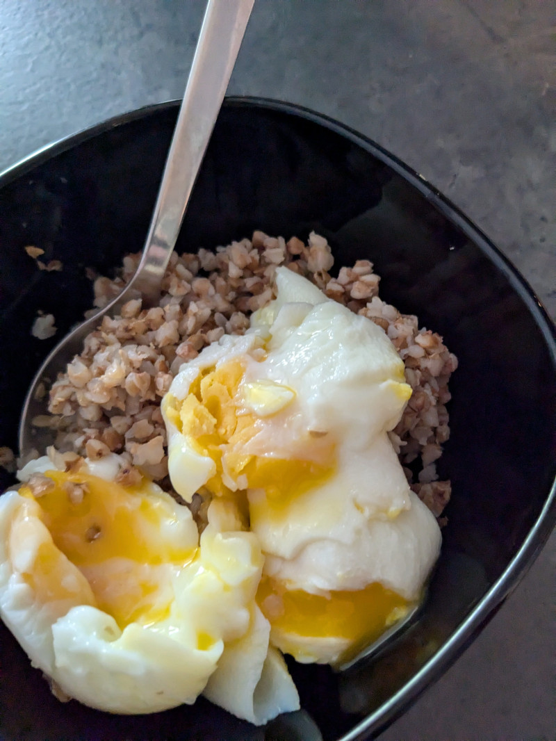 Всем привет! Завтрак был овсянка и чай. Сейчас гречка и 2 яйца. Чай и 1 зефирка. На ужин опять будет гречка и вареная курица.