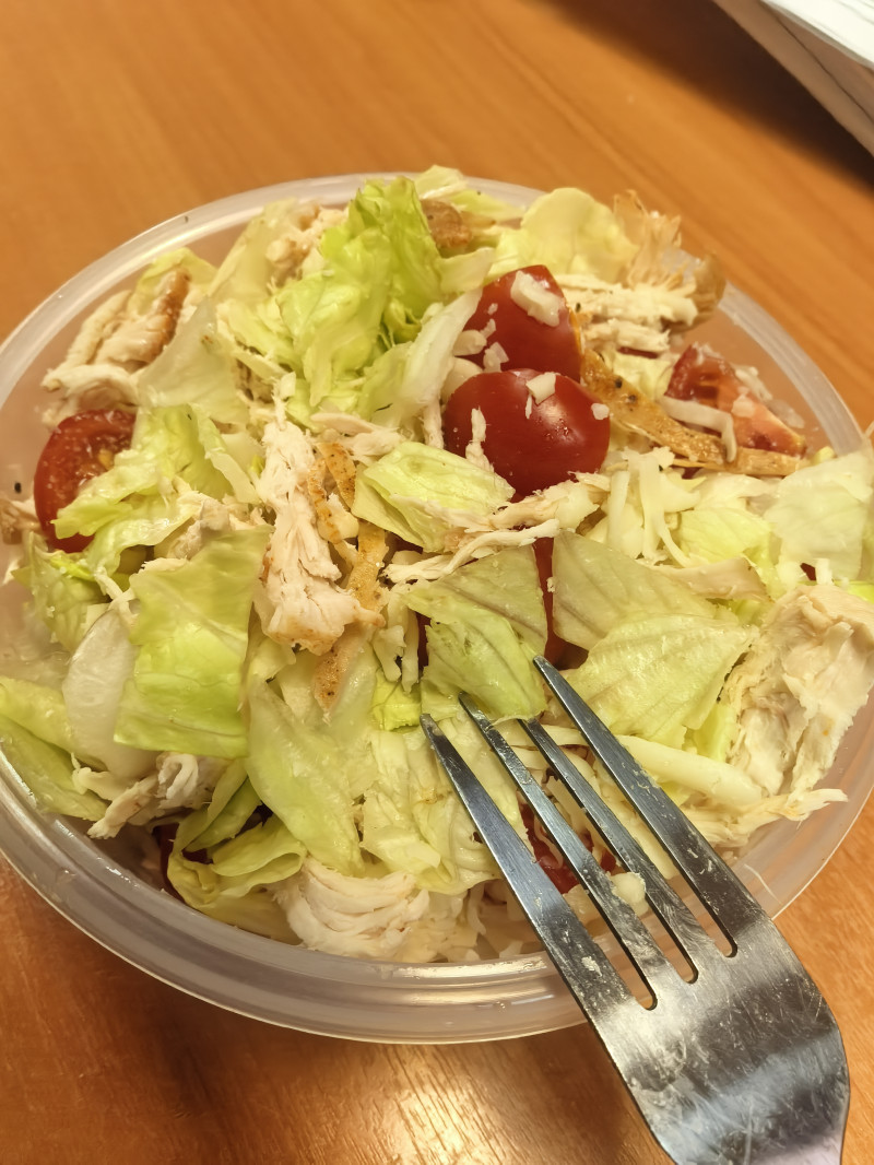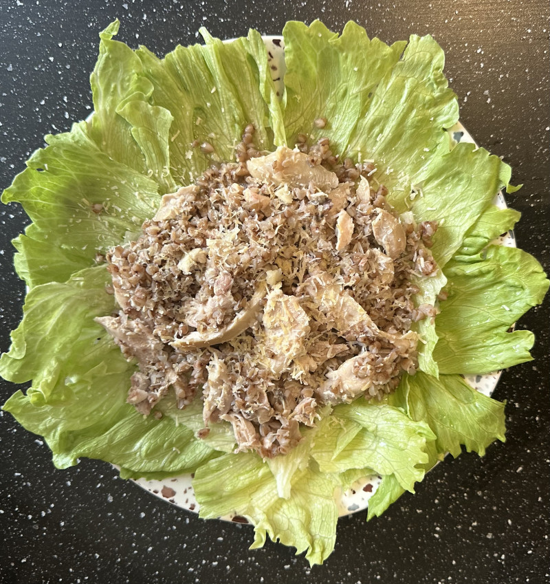 Ну у меня тогда на обед теплый салат «Иван Грозный» айсберг, курица, немного гречки и чуть сыра сверху: